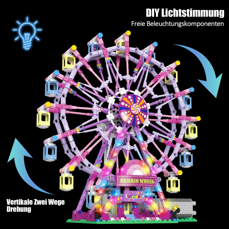 • Full of fun: The fact that the Ferris wheel construction kit also has integrated lighting. This makes the gaming experience even more realistic and fascinating. It is not only a fun building toy set, but also a beautiful night decoration. This rotating giant wheel construction kit with lights for girls from 8 to 12 years creates an enchanting night decoration that gives any room a touch of magic