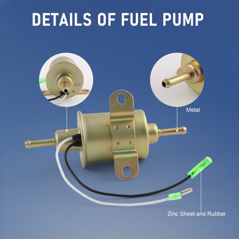 - Fuel Pump Material: 100%Brass(Does not Contain Aluminum); Voltage : 12V; Currents: 1.5A; Output Pressure: 6-9PSI; Flow Rate: 18.5gph; Bolt-on & Go parts