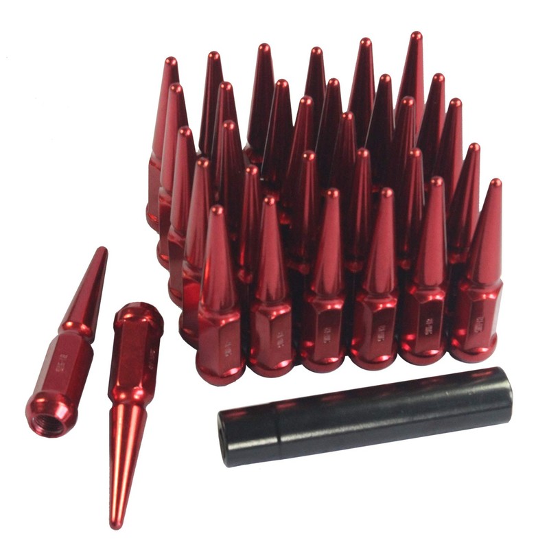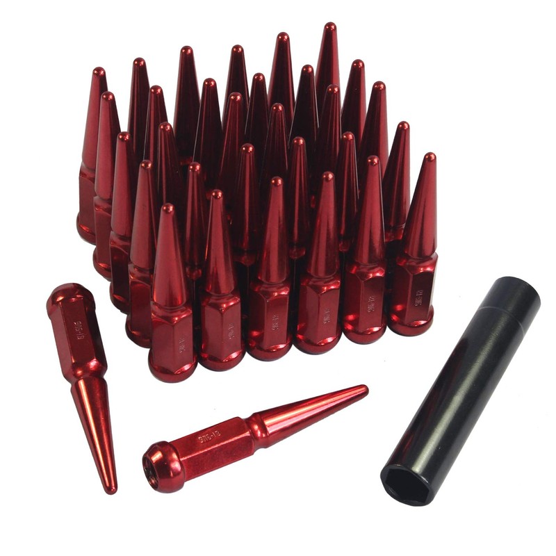 Specifications: 32 Spike Lug Nuts + 1 Keys Style: 1 Piece Solid Construction Type: Closed end Thread Pitch: 9/16''-18 Seat: Acorn (Conical), 60 degree taper Length: 4.4''Tall Width: 0.90''(23mm) Lug Nut Hex: 3/4''(19mm) Drive of Socket Key: 1/2'' Drive Finish: Red Rust Resistant Final Clear Coat ONLY FOR AFTERMARKET WHEELS Replacement For Dodge Ram 1500 2500 3500 1994-2011 Only 9/16 thread Replacement For Ford F250 F350 1988-1998 Only 9/16 thread