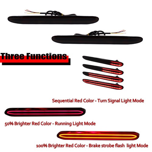 - 3-in-1 : Replaces the OEM rear bumper bulb-less reflectors with LED as add-on tail lights ( 50% led Brighter ), brake lights (100% led Brighter) and turn signal lights (Sequential Lighting).