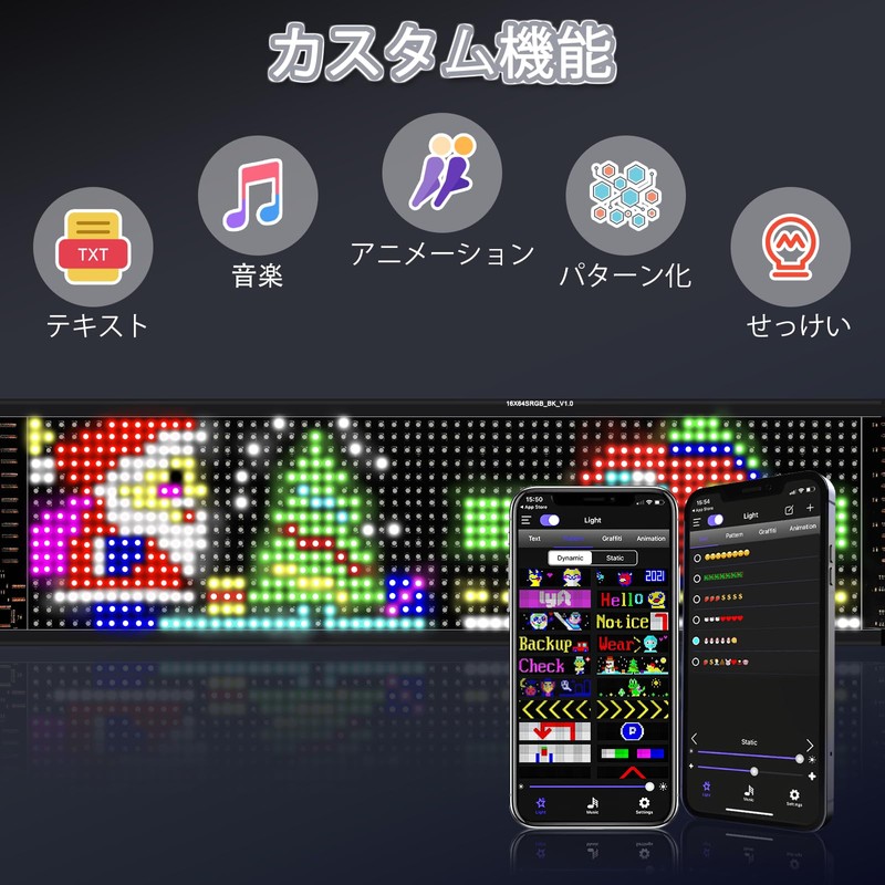 - Easy to operate with the mobile app - Expand your creativity limits This LED light bulletin board can be easily operated using the dedicated mobile app. It has various functions such as letters, pictures, music rhythm, brightness adjustment, etc. This allows you to create your favorite message or design. Display your own messages to enhance your advertising effect, or create designs for special events and seasonal occasions. Get creative and create attractive displays