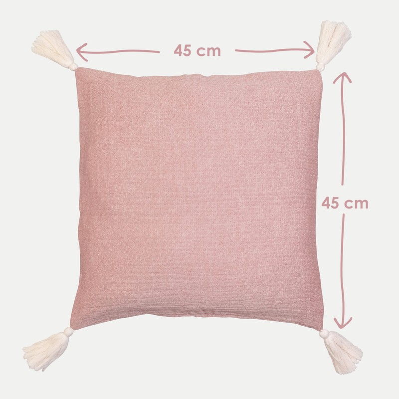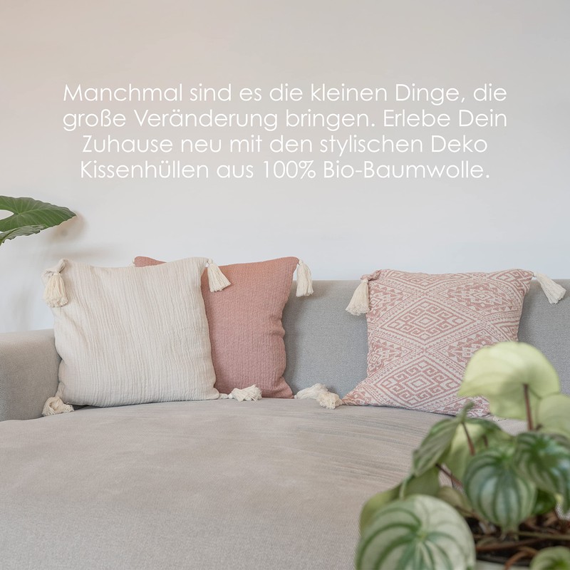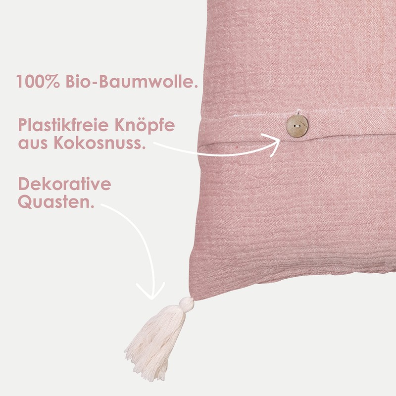 • Box contents: 1 x Jean&Len cushion cover with tassels made from 100% organic cotton, with buttons made of coconut, Oeko-Tex and GOTS certified, in pink, produced in Turkey, pillow cover 45 x 45 cm