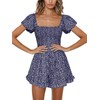 - Característica: estampado de flores bohemio, cuello cuadrado, manga casquillo, cintura alta plisada elástica, dobladillo de volantes fluidos, longitud mini por encima de la rodilla, ajuste y destello.