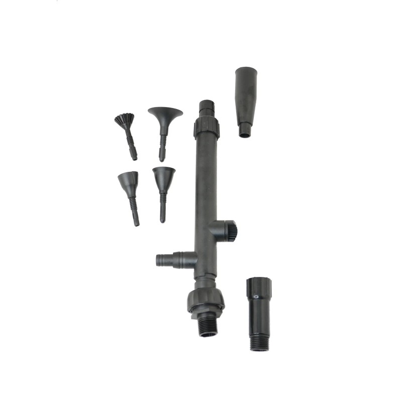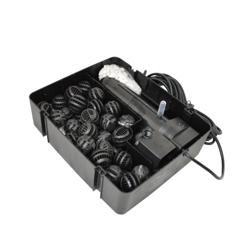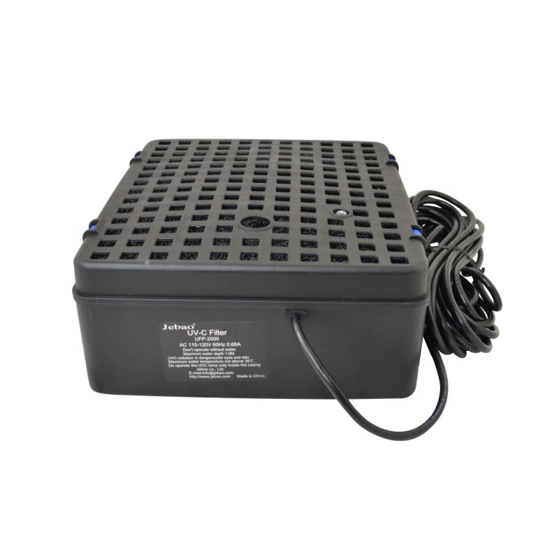 The Jebao All-in-One UFP-2000 System combines everything required to run a healthy algae-free small to a medium sized pond. Designed as a single smart unit with a single power cable it allows for a much easier installation compared to a standard pond set up. The UFP-2000 includes a built-in 13w UVC Lamp and filtration system combined with 530 GPH pump eliminating the need to purchase an external filtration system, which can be difficult to integrate around the landscaping of a small pond. The included filtration media includes a large coarse filter foam that water must pass through first and also three filter media baskets. Alternatively, you could change the included media inside these baskets for an alternative pond filter media of your choice. Access to the inside of the UFP-2000 is extremely easy thanks to the four clips positioned 2 on opposite sides of the unit. Once these are removed you have full access to all filter media areas for cleaning and maintenance. Replacing UV lamp and clean quartz sleeve is achieved by unscrewing one screw, allowing these parts to be removed completely clear of the base. This system is also supplied with a high-quality fountain attachment set comprising of three different fountain attachments, ideal for a variety of displays in your pond. The set also includes a splitter, enabling you to divert water to a waterfall, for example, and both the splitter and fountain are flow-rate adjustable. This gives you total control over the strength of your fountain and the volume of water diverted from the unit. SPECIFICATIONS: 46-watt; Max Flow rate: 530 GPH; Max-head: 8.2ft; Height of fountain tube: 20"-24" ; Outlet: Fits 1/2”, 3/4" ID (inside diameter) tubing; 32 feet power US 3-Prong Ground cable; 110-120v 60Hz; FILTER DIMENSIONS: 14.5 X 12 X 5.25 inches (L x W x H)