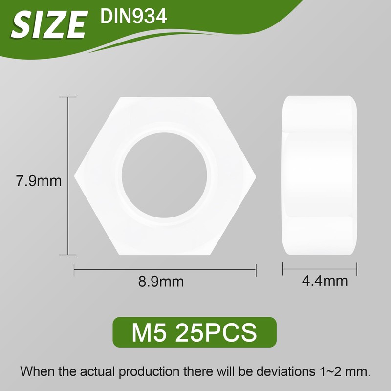 Jeboler Plastic Nuts M5 (Pack of 25), DIN934 Nylon Hex Nuts, Hex Nut Plastic Nut, Hexagonal Nut White for Threaded Rods & Screws & Washers