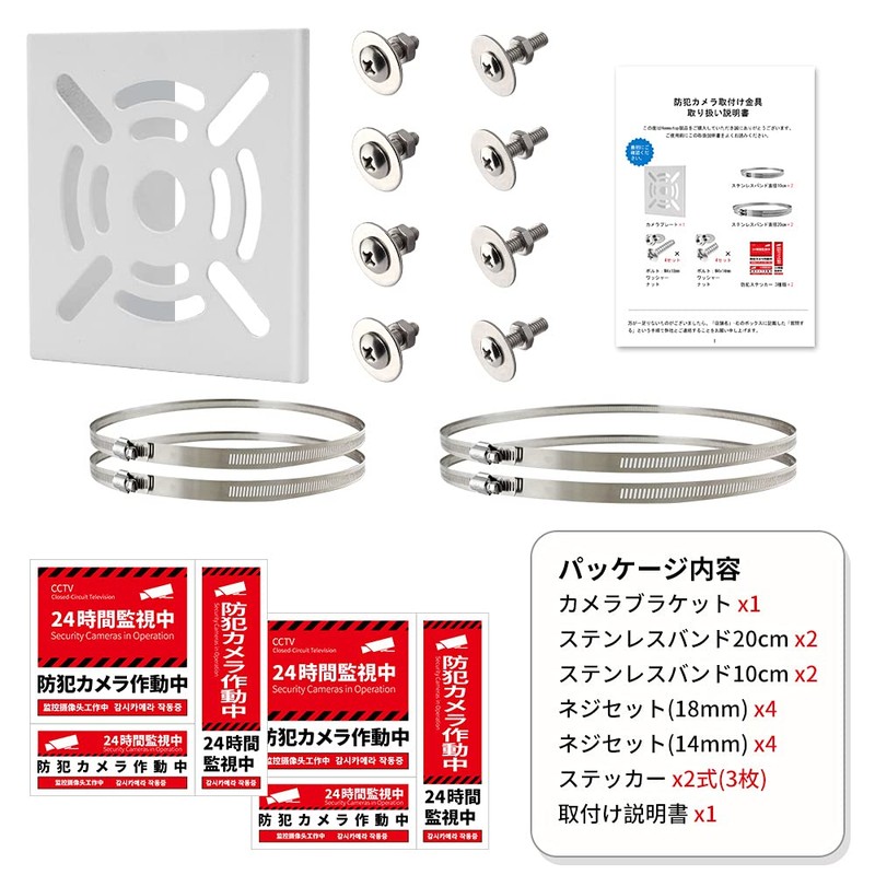 - (Complete Set of Necessary Items) Recommended for those who suffer from installing a security camera purchased. Comes with all necessary mounting hardware so you can install your security camera in no time. Set Contents: 1 Mounting hardware x 1, 4 stainless steel bands (2 each of 0.4 inches (10 mm) / 20 mm (2 pieces each); 4 sets of M4 bolts (4 x 14 mm) / M4 x 0.7 inches (18 mm); 4 sets of 8 sets of each of M4 (3 types); Instruction manual (English language not guaranteed); Material: Iron, stainless steel); English language not guaranteed)