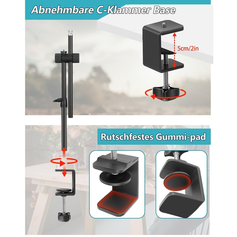 - Multifunctional table mount: with 360° ball head (1/4 inch screws), 9 cm/3.54 inch mobile phone holder (1/4 inch screws), suitable for light cameras, smartphones, mobile phones, webcams, LED ring light and many other devices. Features a 360° flexible overhead extended holding arm (1/4 inch screws) that can support overhead shots