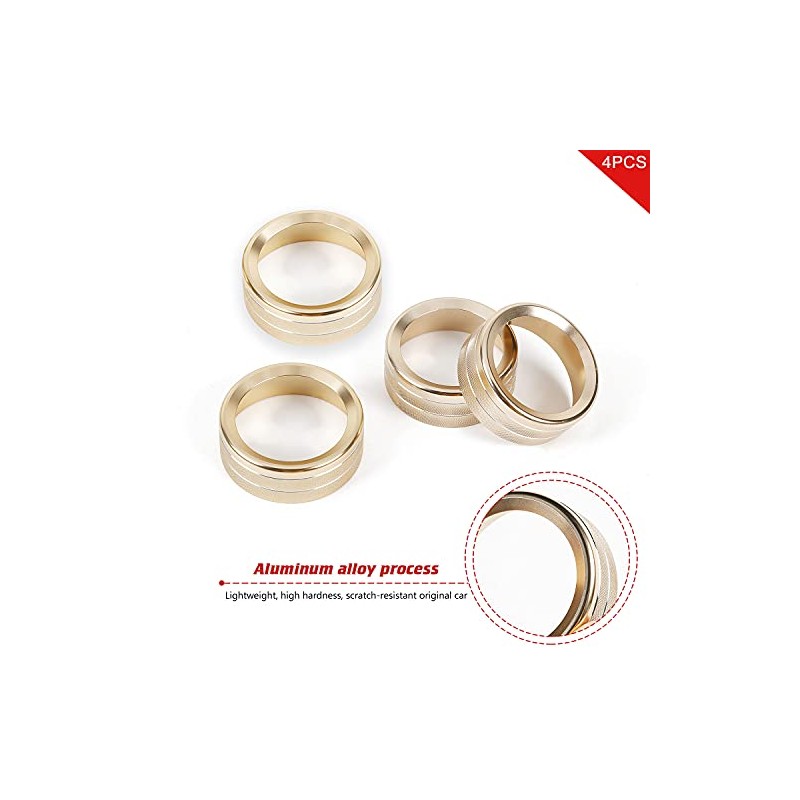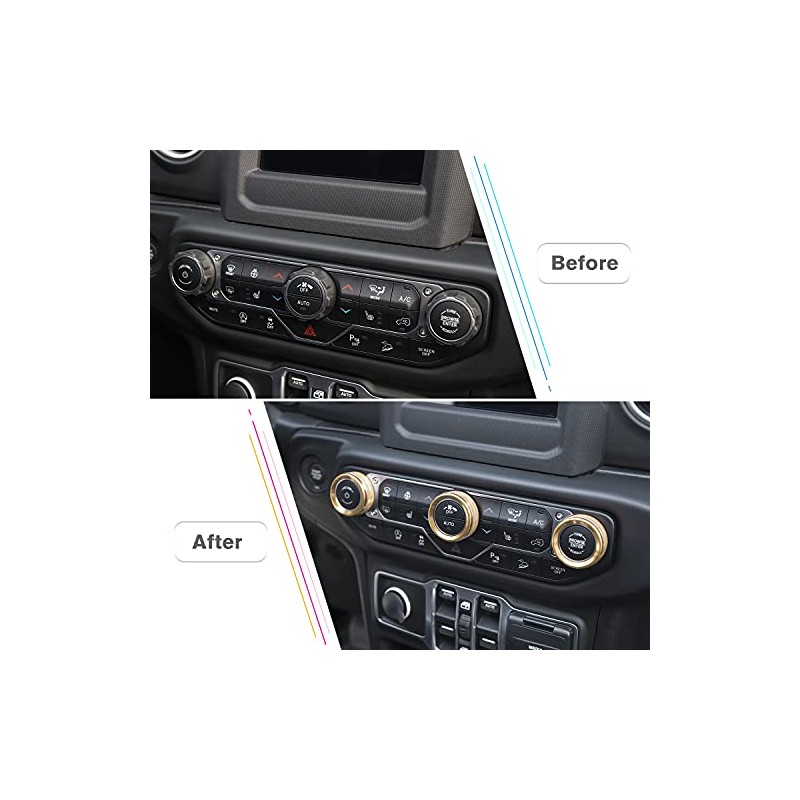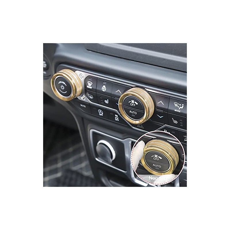 Fitment:Compatible with Jeep Wrangler 2018 2019 2020 2021 2022 2023 JL JLU & 2020 2021 2022 2023 Gladiator JT with specific dial panel.Features:- 100% Brand New- Color: Gold- Material: Aluminum Alloy- Easy Installation- Interior Upgrade- Durable & Rust-ProofSpecial Mold Design. The button cover uses a specific mold to ensure a perfect fit for Wrangler JL JLU 2018-2023 & Gladiator JT 2020-2023.High-Quality Material. Made of Aluminum Alloy that is rust-proof and durable.Easy Installation. Straightforward installation without any tools. Just press the button cover into the knob.Attention:The JL and JT have 3 different kinds of AC control knobs (see #2 product picture). Please compare your AC knobs with our picture before you purchase.Package Included:- 3 x JL AC switch knob covers- 1 x Headlight knob cover