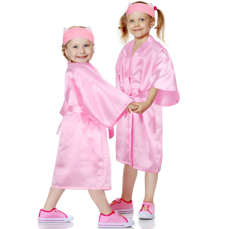 Jecery 5 Pack Kids Birthday Squad Girl Robes Silk Satin Spa Party Robes Flower Slumber Robes DIY Bathrobes with Headband for Party (Pink, 8)