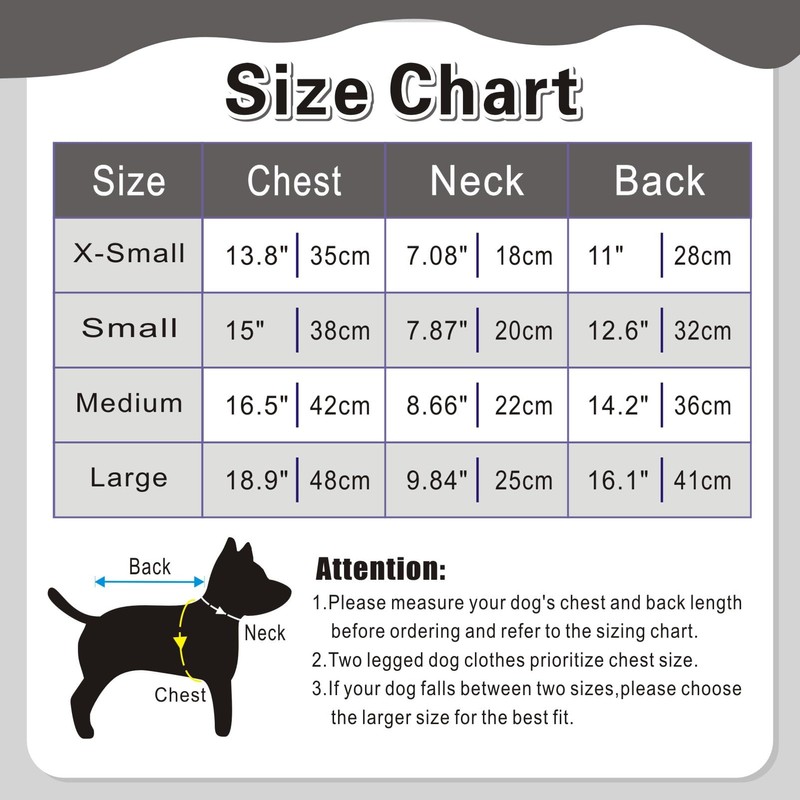 - Before placing your order,please take a moment to carefully review our size information.Remember,it's not about your usual size—it's about your pet's.Measure your pet's chest girth and back length,then select the right size using our size chart.