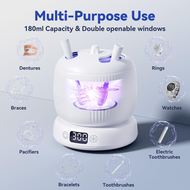 • 4 Preset Modes & Easy Operation | The invisalign retainer cleaner offers one-touch controls that let you select 5, 8, or 10-minute ultrasonic cleaning cycles or switch to light-only mode. A visible countdown is displayed, making it ideal for cleaning retainer trays, aligners, or other oral care devices quickly and easily.