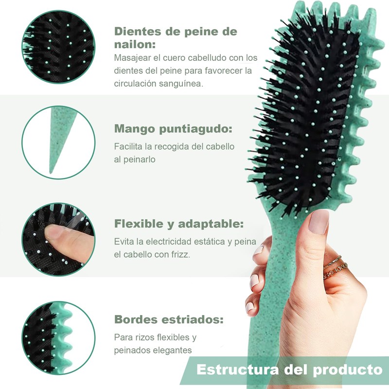 - Define tus rizos con rebote natural y sin frizz: Ideal para cabellos rizados u ondulados, este cepillo ayuda a esculpir rizos con forma, volumen y movimiento, sin encrespamiento ni rigidez. Puedes usarlo tanto en cabello mojado como seco, con o sin productos de styling. Notarás rizos más definidos, sueltos y con un acabado profesional.