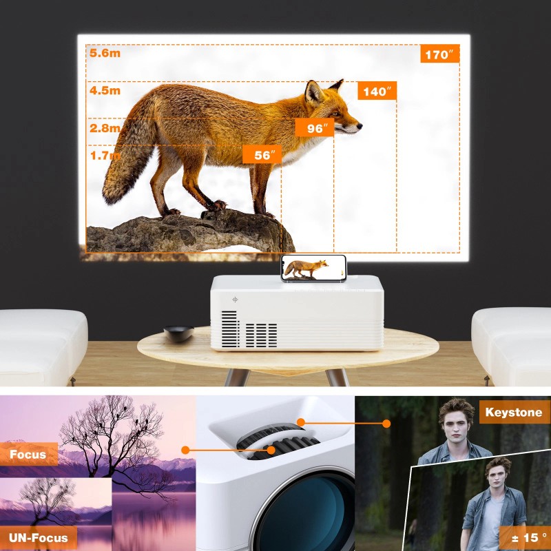 ▶【Keystone Correction & Zoom Function】 Equipped with ± 15° Keystone Correction, reduces vertical or horizontal image distortion effectively. Zoom capabilities allows the screen size of the smart projector can be individually adjusted without changing the projection distance frequently. It means you can easily adjust your screen to be rectangular and enjoy the clearest pictures.