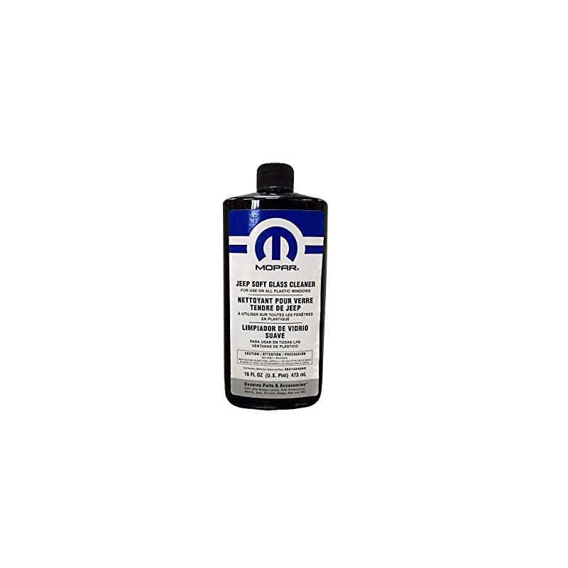 This is a 16 oz. bottle of Mopar Soft Glass Cleaner used to remove fine scratches and clean plastic windows without scratching. This genuine OEM Mopar product also helps prevent yellowing of the plastic.
