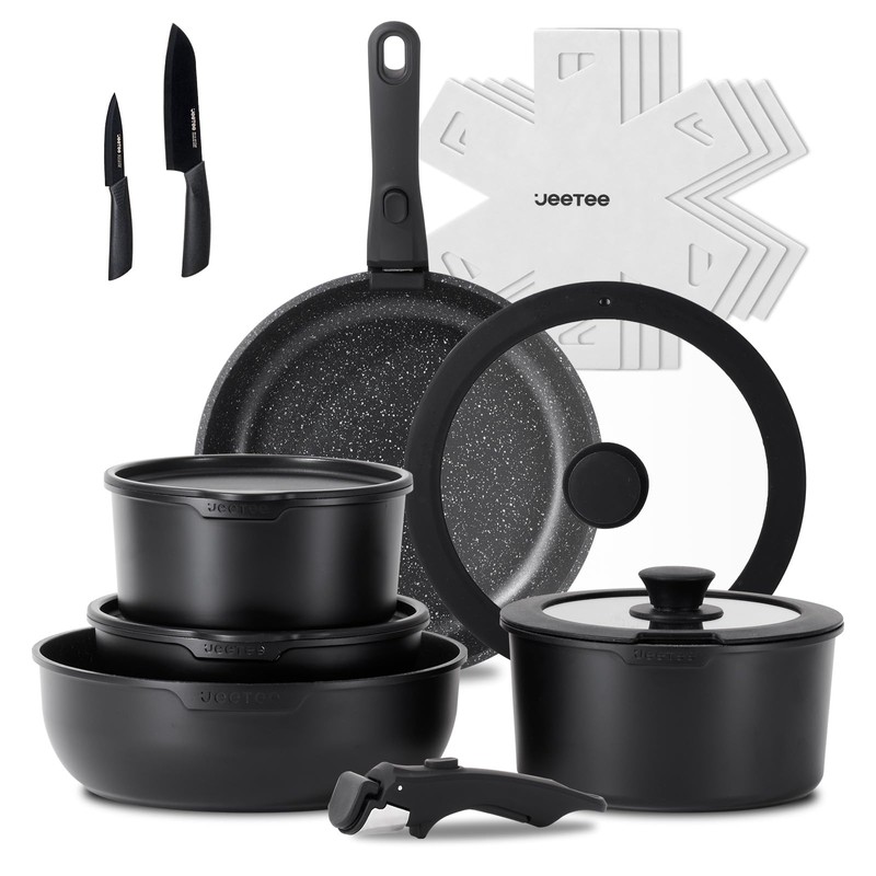JEETEE Pots and Pans Set Non Stick 17pcs, Kitchen Cookware Sets with Detachable Handle, Induction Nonstick Cookware Set with Removable Handle, Stackable RV Cookware, Oven Safe, PFAS/PFOA Free, Black
