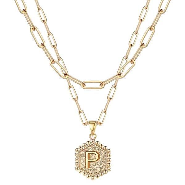 JeeweLife P Initial Necklaces 18K Gold Plated Layered Paperclip Chain Hexagon Letter Pendant Chunky Gold Necklaces for Women, Initial P