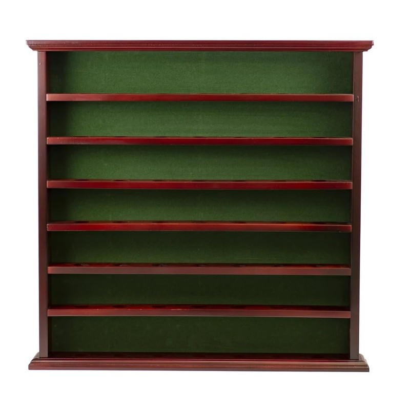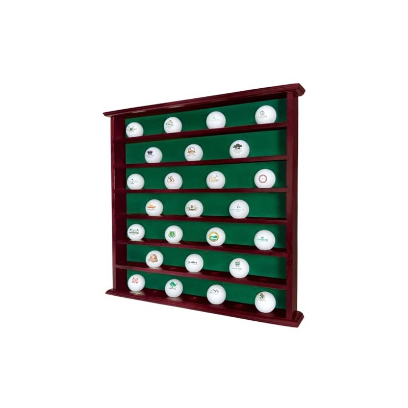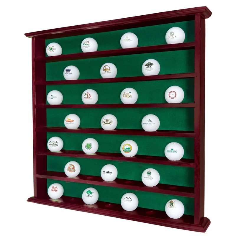 Ideal for any office, den, or family room, this elegant golf ball cabinet from Golf, Gifts & Gallery is perfect for displaying hole-in-one balls and other trophy keepsakes. The cabinet is made of high-quality mahogany-finished wood, with a green felt background offering a nice contrast to the balls' white color. In addition, users can locate the cabinet just about anywhere, as it mounts easily to a wall or sits on a table. Holding up to 49 balls at once, the cabinet carries a 90-day warranty.
