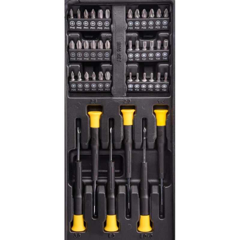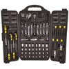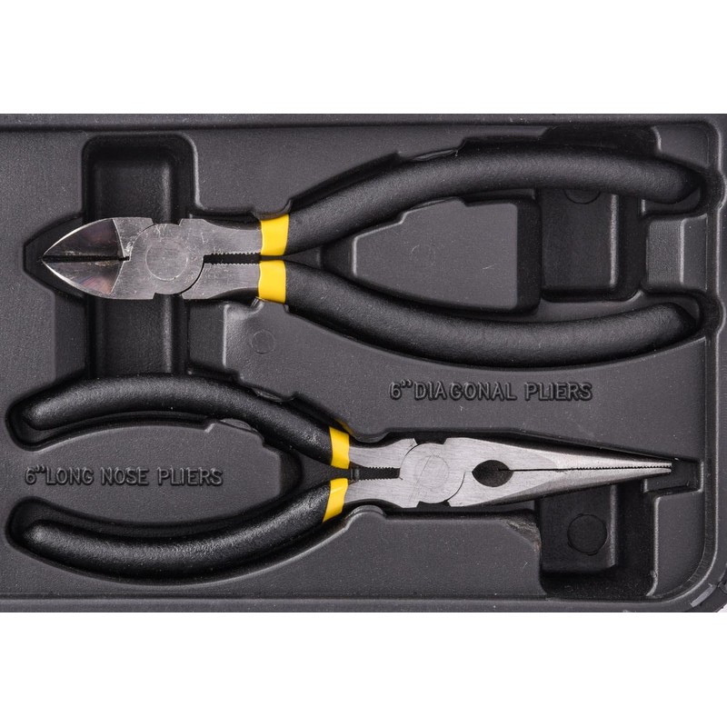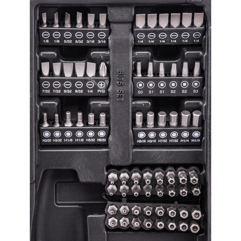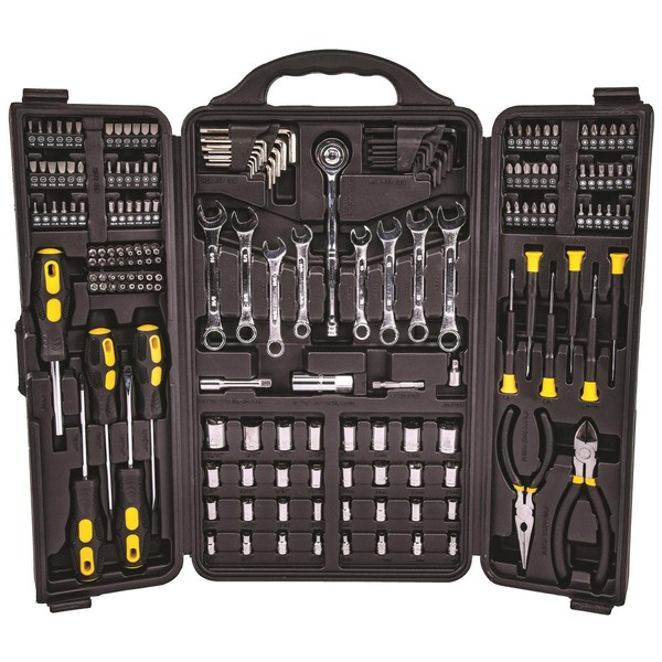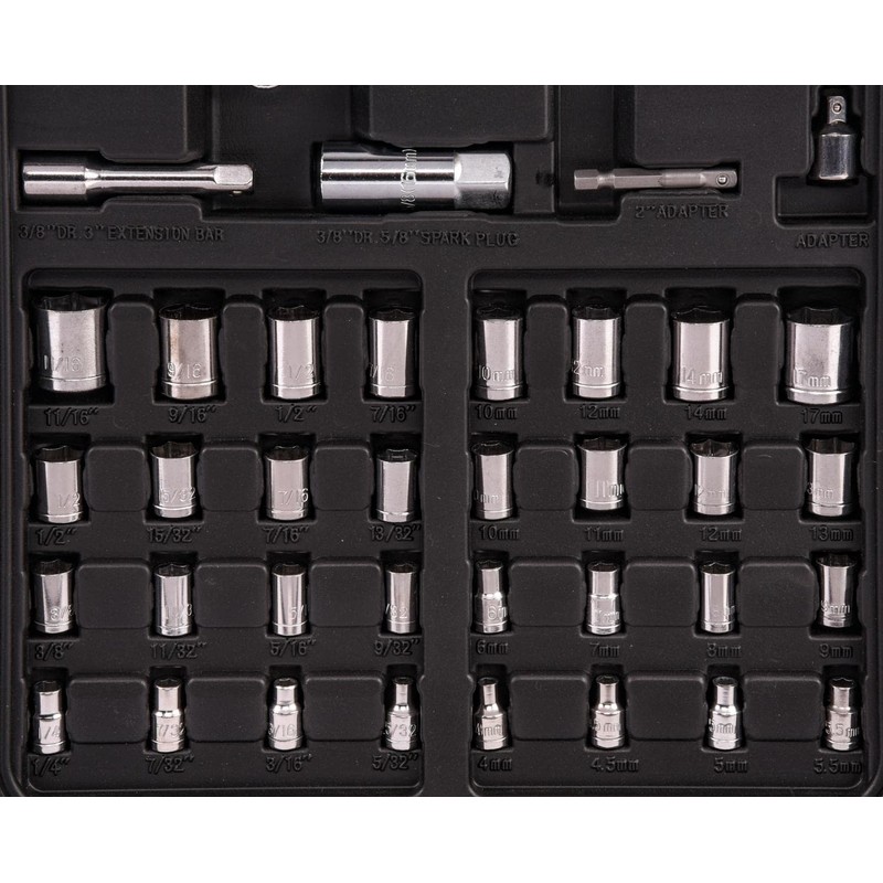- INCLUDES: 3/8 “ drive ratchet handle, 3 “ long x 3/8 “ drive extension bar, 1/4 “ male x 3/8 “ female adapter, 5/8 “ long x 3/8 “ drive spark plug socket, (12) 1/4 “ drive standard sockets, (12) 1/4 “ drive metric sockets, (8) 3/8 “ drive sockets, (8) combination wrenches, (84) bits, (33) safety bits, drive handle, (4) screwdrivers, (6) precision, screwdrivers, long nose pliers, diagonal pliers, (12) hex key metric wrenches, (12) hex key standard wrenches, & blow molded carry case