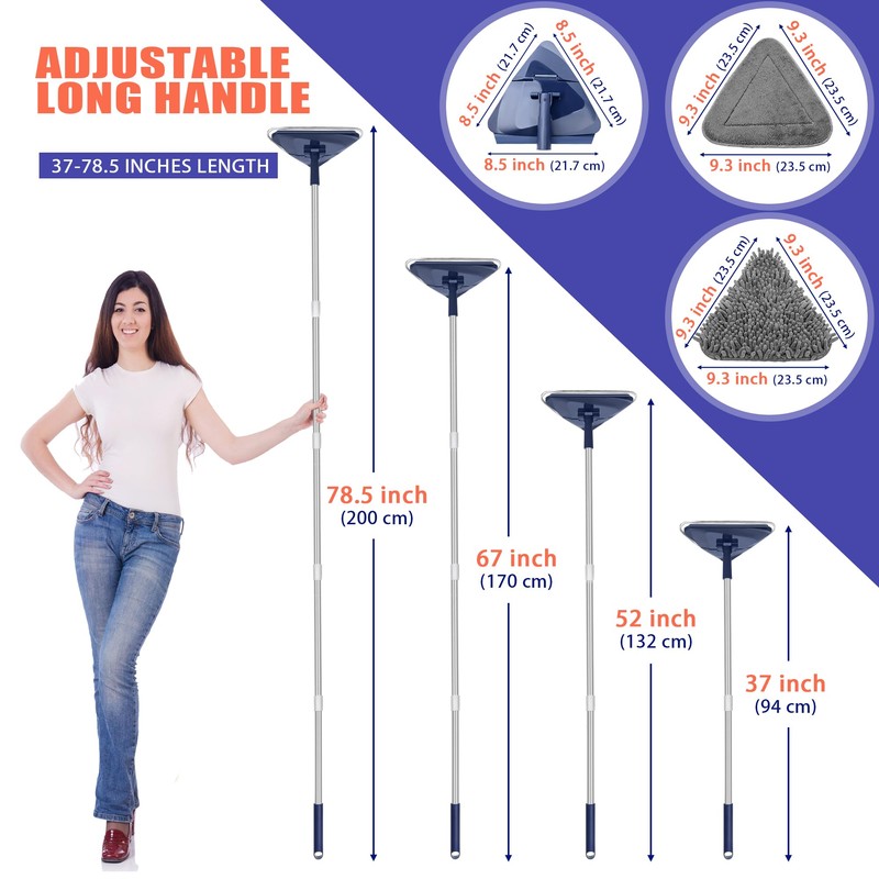 - 6 PCS PADS FOR DRY & WET USE: The triangle mop comes with 3 Pcs microfiber pads and 3 Pcs chenille pads. The microfiber pads can be wet-used for mopping and window cleaning, while chenille pads can be dry-used for dusting and removing spider webs.