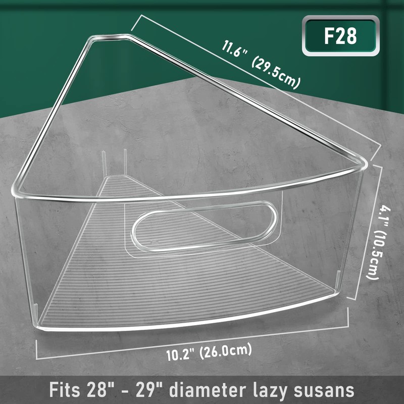 - Three Size Options: One for 26" diameter corner lazy Susan, one for 28", and the other for 32". Please make sure you measure the diameter of your lazy susan first and then CHOOSE THE RIGHT SIZE bins. More Quantity Options: Four bins create a semicircle, Six bins create 3/4 circle, Eight bins create a circle.