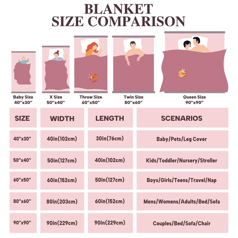 - Size: 30"x40"; 40"x50"; 50"x60"; 60"x80"; 90"x90" for kids, toddler, teens, adults, pet blanket; wrap yourself with this blanket to enjoy snug warmth for all seasons, suit for sofa, couch, bed, car and office