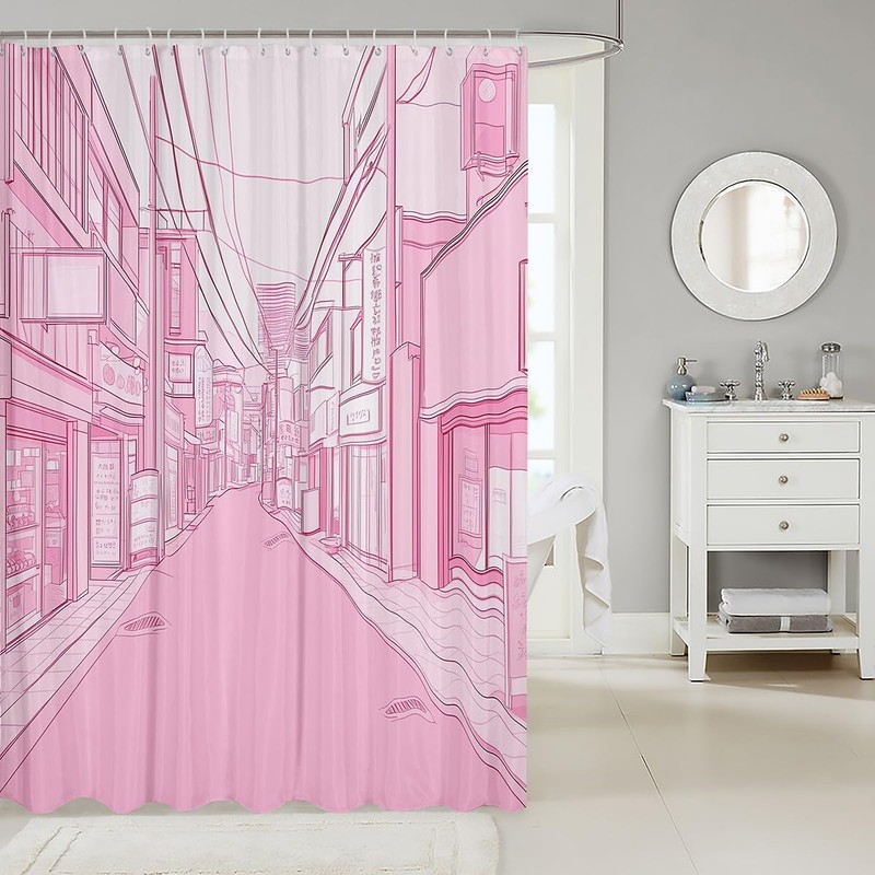 jejeloiu Girls Tokyo Street Shower Curtain 72"x72" Pink Japanese Street Bath Curtain for Boys Teens Traditional Retro Bathroom Shower Curtain Set Waterproof Japanese Ukiyoe Kids Bathroom Accessories