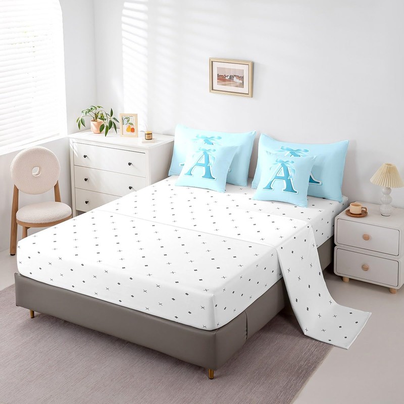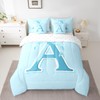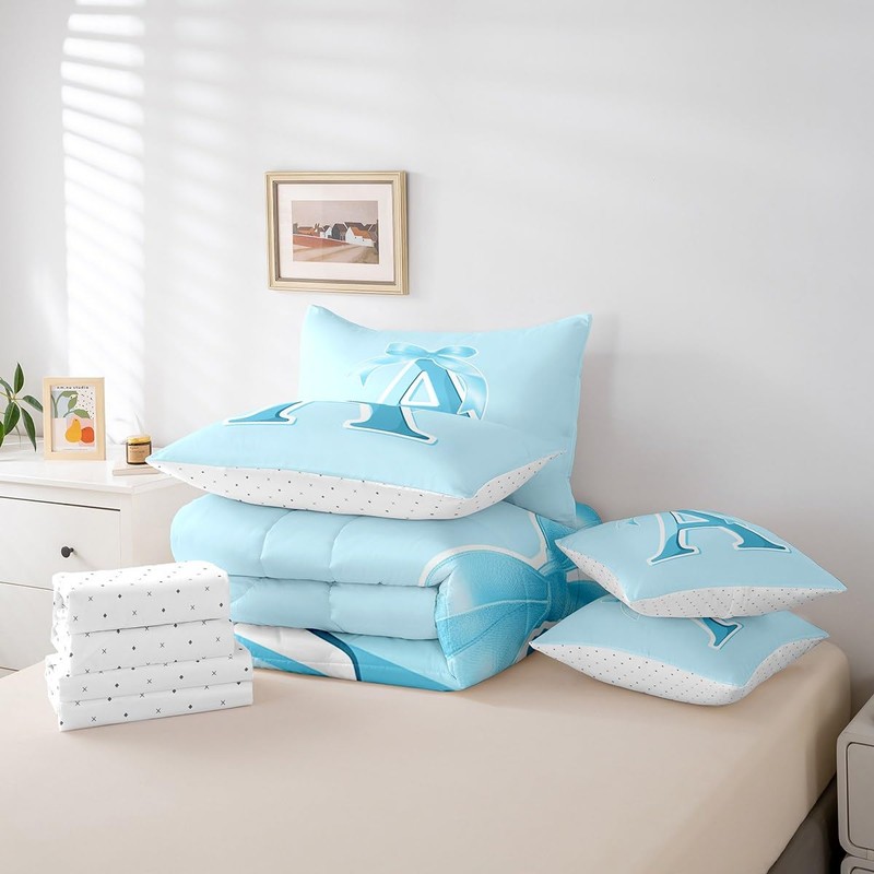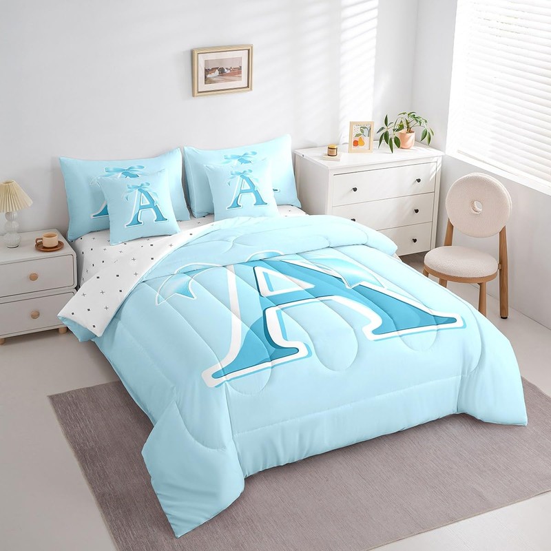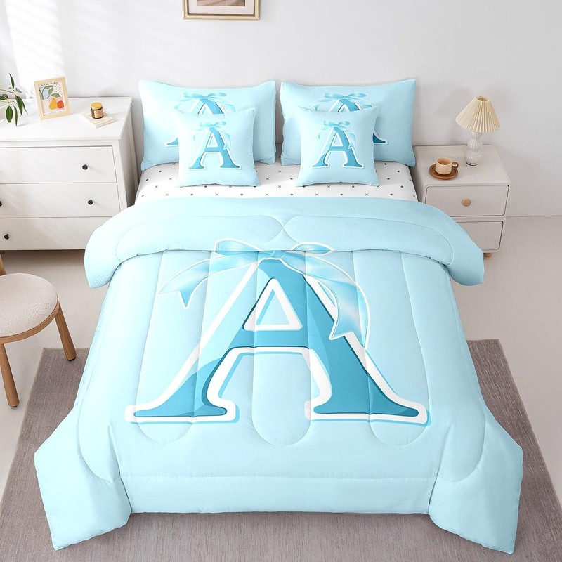 jejeloiu Kids Girls Blue Bow Comforter Set with Sheets Twin Size Monogrammed 7 Piece Bedding Set Personalized Initial A Bed in a Bag with Comforter, Sheets, Pillowcases Modern Fashion Bed Set Bowknot