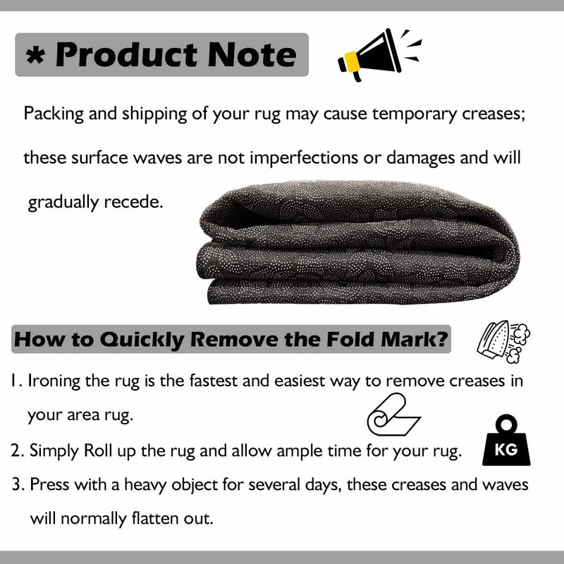 - Note: Please be aware that rugs may arrive with temporary creases; the quick and effective method for removing these creases is to iron the rug; alternatively, you can also reverse roll the rug to flatten it over several days