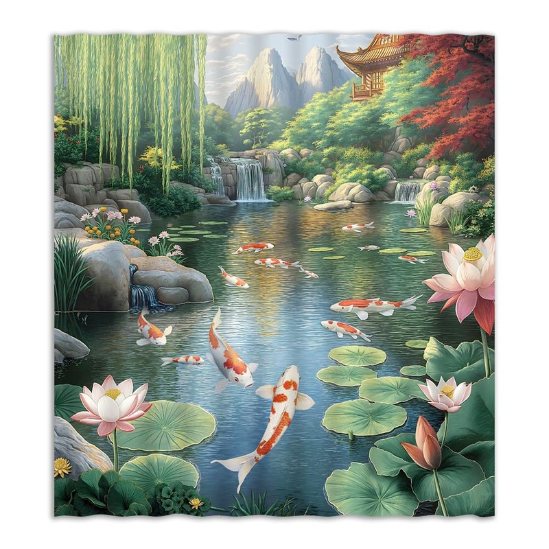 JEJOMEAG Japanese Garden Shower Curtain Lotus Flowers Green Leaves Red Fish Park Waterfall Spring Summer Nature Scenery Fabric Bathroom Decor Curtain with Hooks, 70Wx70H