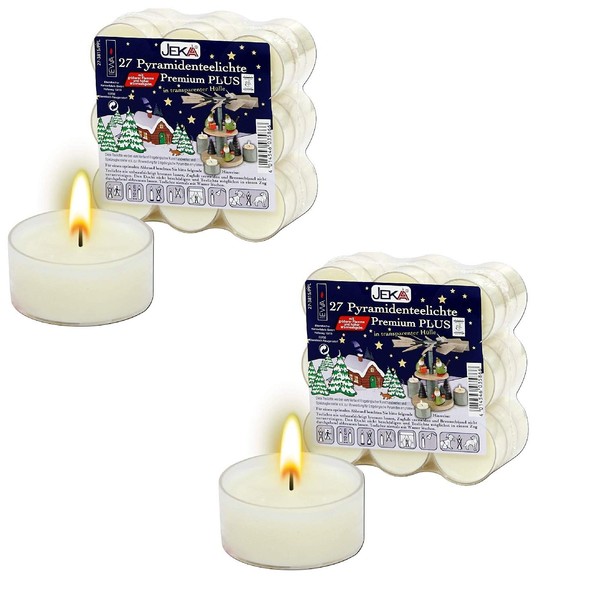 - 2 x pack of 27 very high-quality tea lights in transparent spout, specially developed for tea light pyramids.