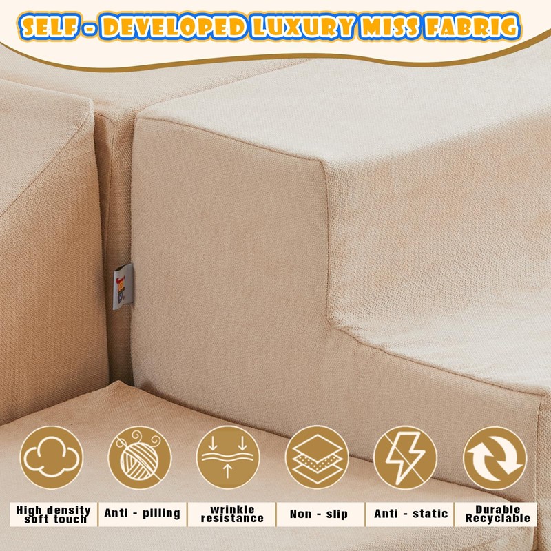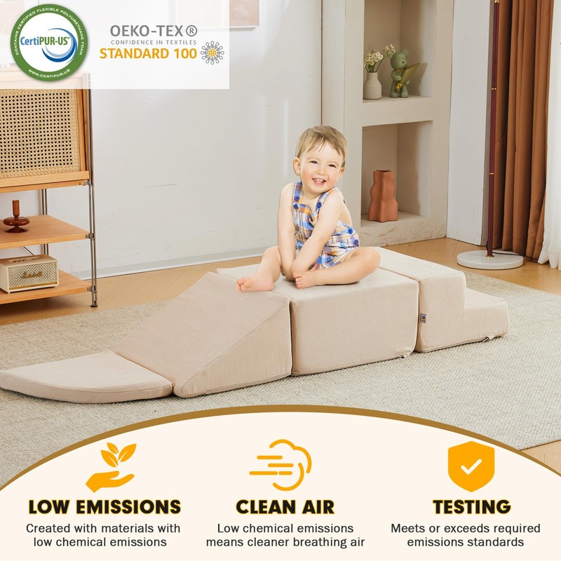 - Luxury Miss Fabric: The toddler soft play climbing set is made with a different material from the leather commonly seen on the market. It uses the highest standard eco-friendly polyester fabric, which is durable, wrinkle-resistant, not easily deformed, soft, and breathable, caring for children's health. The texture of Miss fabric meets the standards of high-end furniture and can blend into your living room.