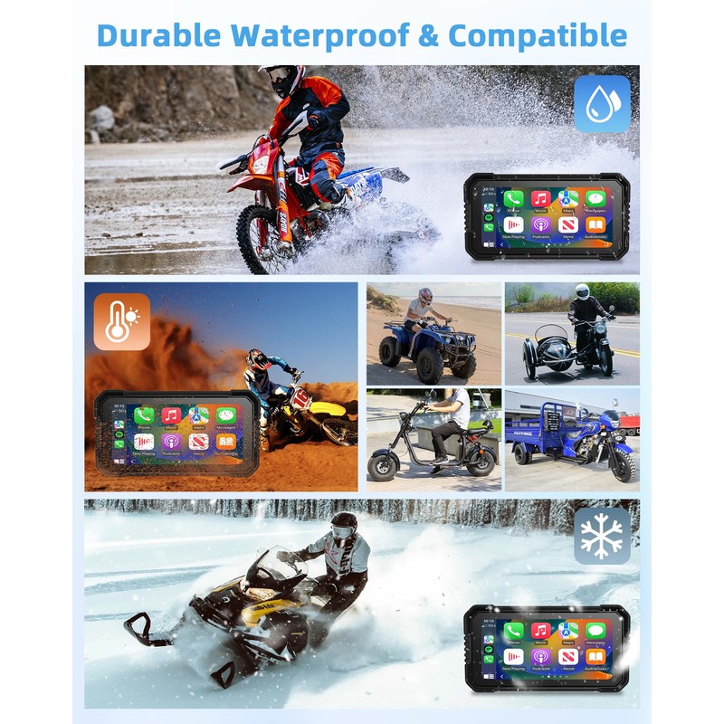 - 【IP67 Aaterproof & Multi-scenario Application】Portable Moto carplay screen has an automatic light-sensitive function that automatically adjusts the brightness of the screen according to the ambient light conditions to make the navigation and key information on the motorcycle carplay screen clearer, enhancing comfort and reducing eye fatigue. carplay motorcycles has IP67 protection rating and an anti-theft removable bracket, which makes it perfect for driving in torrential rains or scorching sun