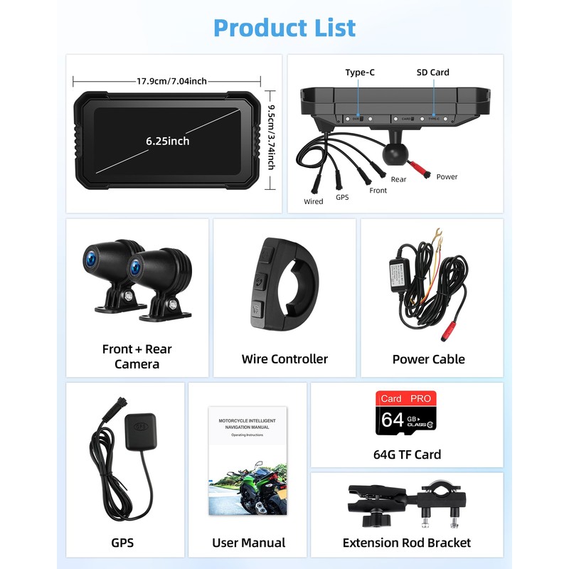 - 【4K Motorcycle DVR with Dual Cameras】The 6.25 inch motorcycle carplay comes with 4K dashcam function, which supports front and rear split-screen display. With 64G TF card, it can realize loop recording, parking monitoring, G-sensor and so on. Capture important footage in time to better protect your car. Carplay motorcycle built-in the latest RV1126 chip, which can realize the technical features of multi-level noise reduction and 3-frame HDR, presenting more vivid and stable video images