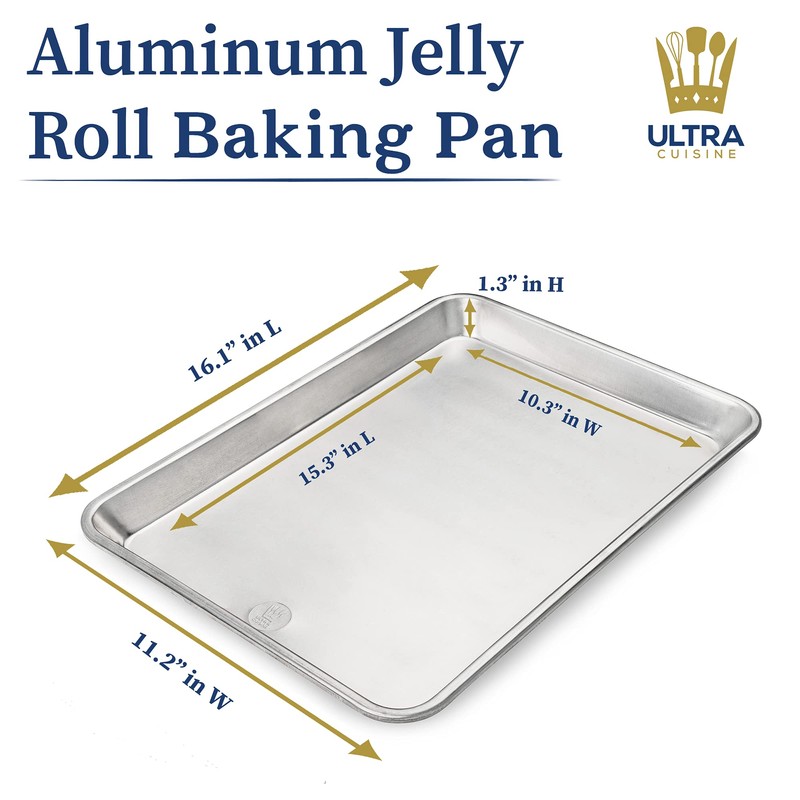 • BAKE LIKE A PRO FOR A LIFETIME: Bake evenly with commercial-grade, warp-resistant aluminum baking sheet pans. Ultra Cuisine’s aluminum baking pans are designed with premium aluminum for superior baking and a specialized reinforced steel rim to prevent warping. The jelly roll pans measure exterior 16.1 x 11.2 x 1.3-inches and interior 15.3 x 10.3 x 1.3-inches - set of 2 jelly roll sheet pans