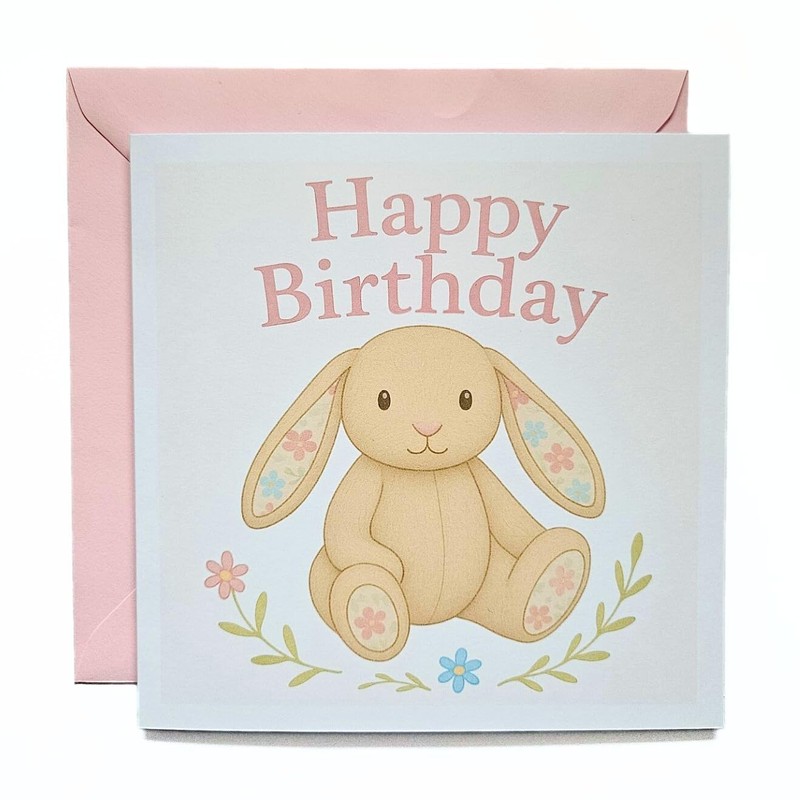 - DESIGN: Sweet birthday card featuring an adorable cream-coloured bunny with floral-patterned ears, surrounded by delicate flowers and foliage