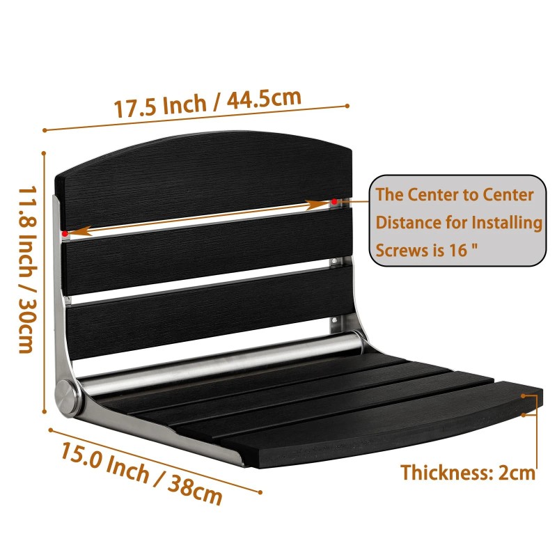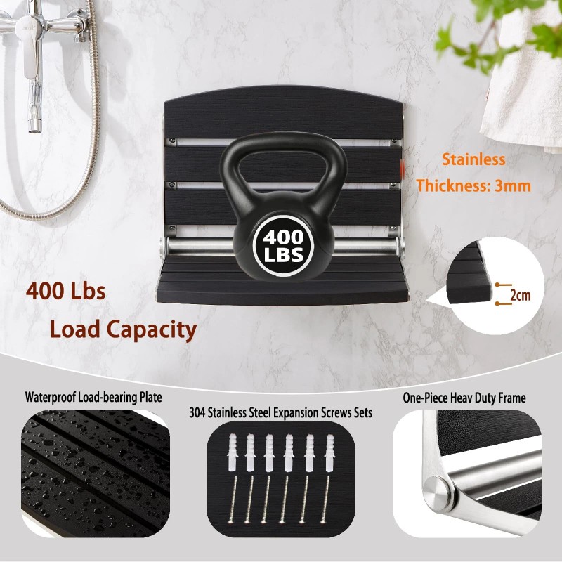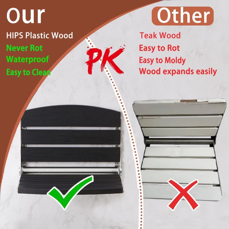 👍【Long lasting durability】 This wall mounted folding shower seat is made of high-strength stainless steel and poly lumber,it looks like real wood from out look. which is more waterproof, rust,resistant and durable than teak fold shower bench. And no maintenance.