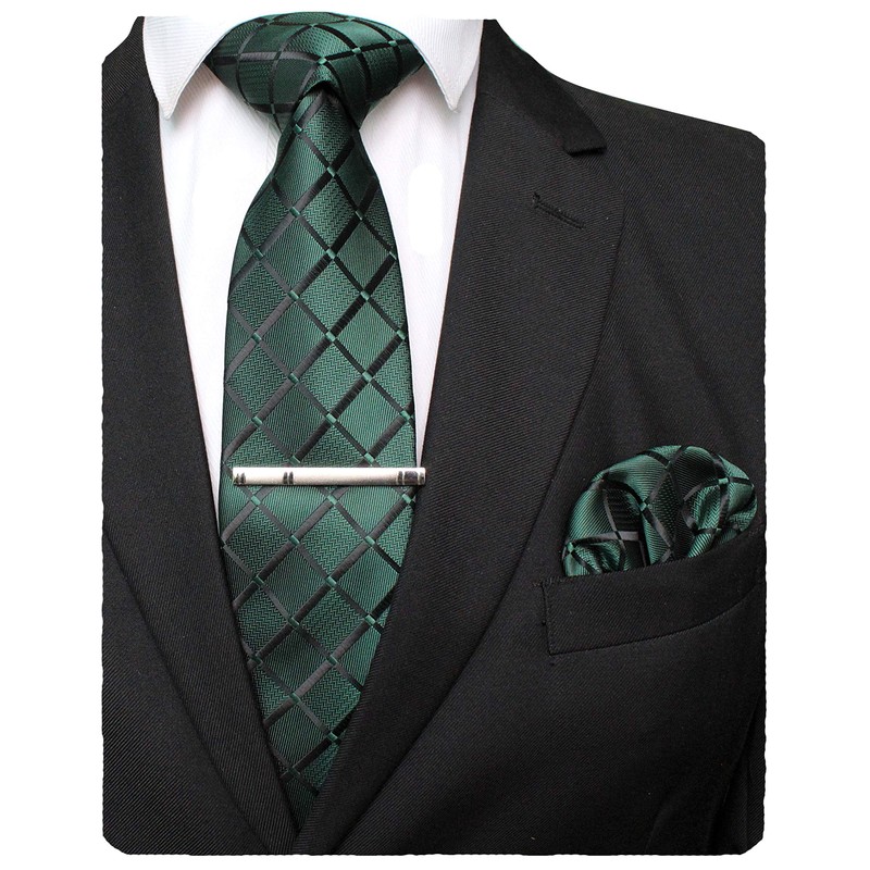 Jemygins Men’s Wedding Checked Ties and Handkerchiefs - Plain Set with Tie Clips - Various Colours - dark green, size: m