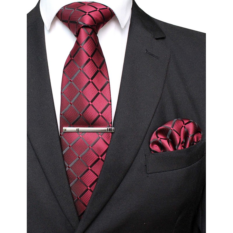 JEMYGINS Mens Check Silk Tie & Tie Clips & Bag Set Dark Red, darkred, 80