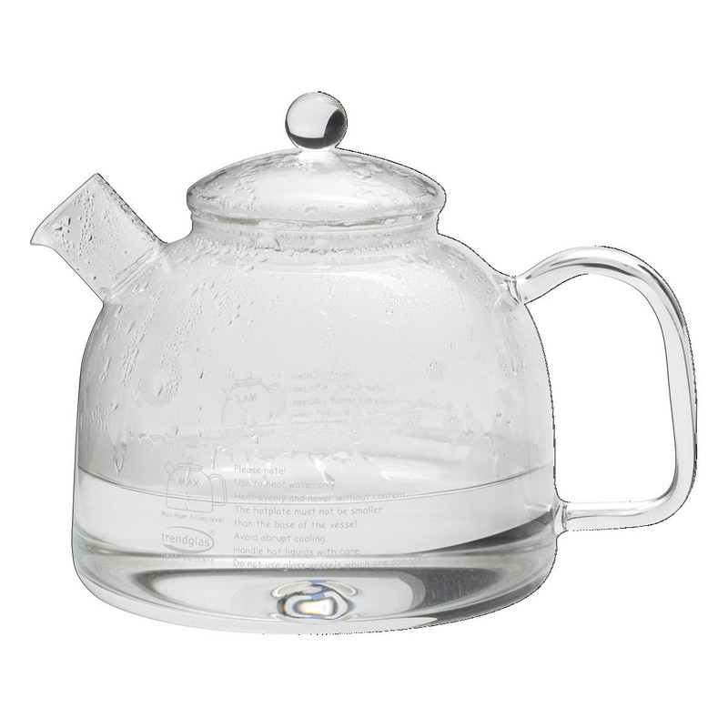- Water kettle for all kinds of stoves (except induction). Use only for water-based liquids. Kettle and lid made of heat resistant glass with white print (usage instructions) Made with borosilicate glass Large comfortable handle Glass lid Volume: 1.75L (59oz) Size: H 162 / W 220 / L 164 mm (6.4 / 8.6 / 6.5") FRAGILE- this item is made entirely of glass