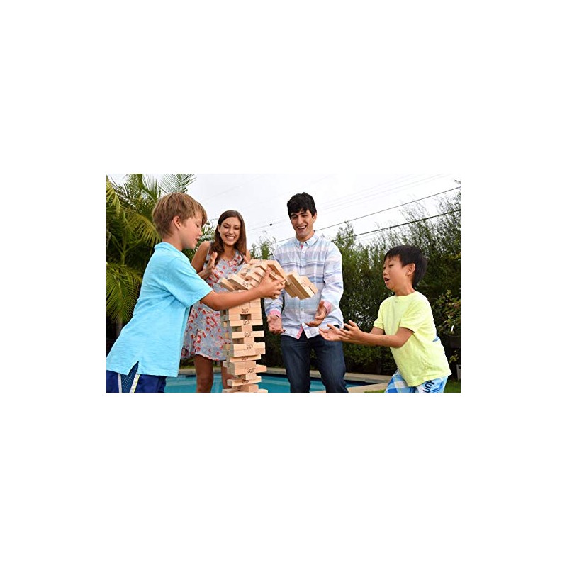 Jenga GIANT Family Edition -- NOW it's a party! Get the kids ready for bigger build-ups and bigger crashes, as the classic block-stacking, stack-crashing game Jenga now has a jumbo sized counterpart that is safe and fun for kids as young as 6 years old! The blocks are over 6 times the size of Classic Jenga, and yet this game is still safe and portable. For an even bigger hardwood Jenga experience, check out the Jenga GIANT Genuine Hardwood Game, for ages 8 to adult, which can stack to over 4 feet high (over 5 feet with available Booster Pack sold separately)!