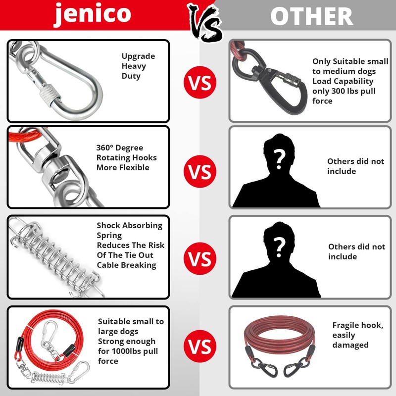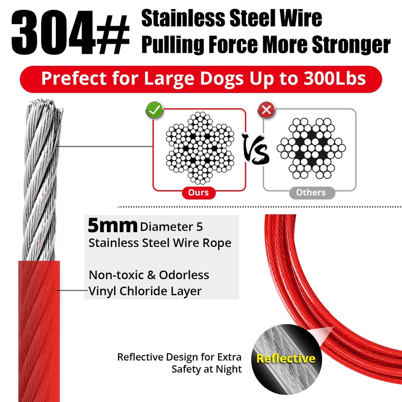 - 🐶High Tensile Strength:jenico dog wire leash cable is a heavy duty dog chain, made of 5mm high-strength galvanized steel wire rope with PVC coating,which are professionally tested for tensile and quality, it can withstand up to 51KN of tensile force.providing superior strength and durability against breakage!Good corrosion resistance, will be reliable to use.