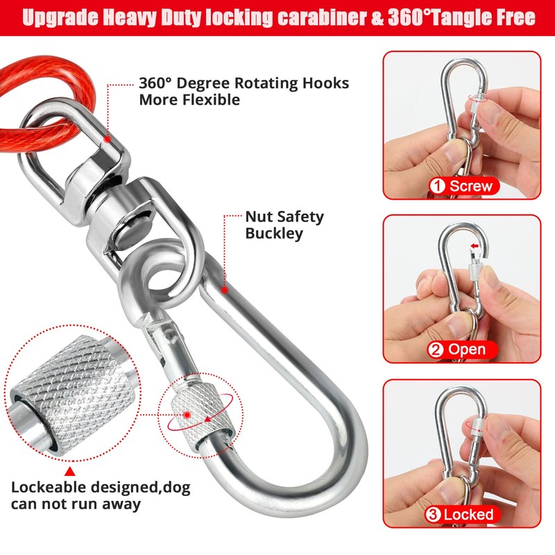 - 🐶Upgrade Heavy Duty locking carabiner & 360° Tangle Free:Unlike most ordinary dogs with buckles, our dog leash uses heavy duty locking carabiner, stronger and more durable, with stand 500lbs pull force.The hooks will not falling off ,no matter how vigorous your pet is!The dog leash loop has a 406° smooth rotation axis, your dog can dance without worrying about tangled ropes!