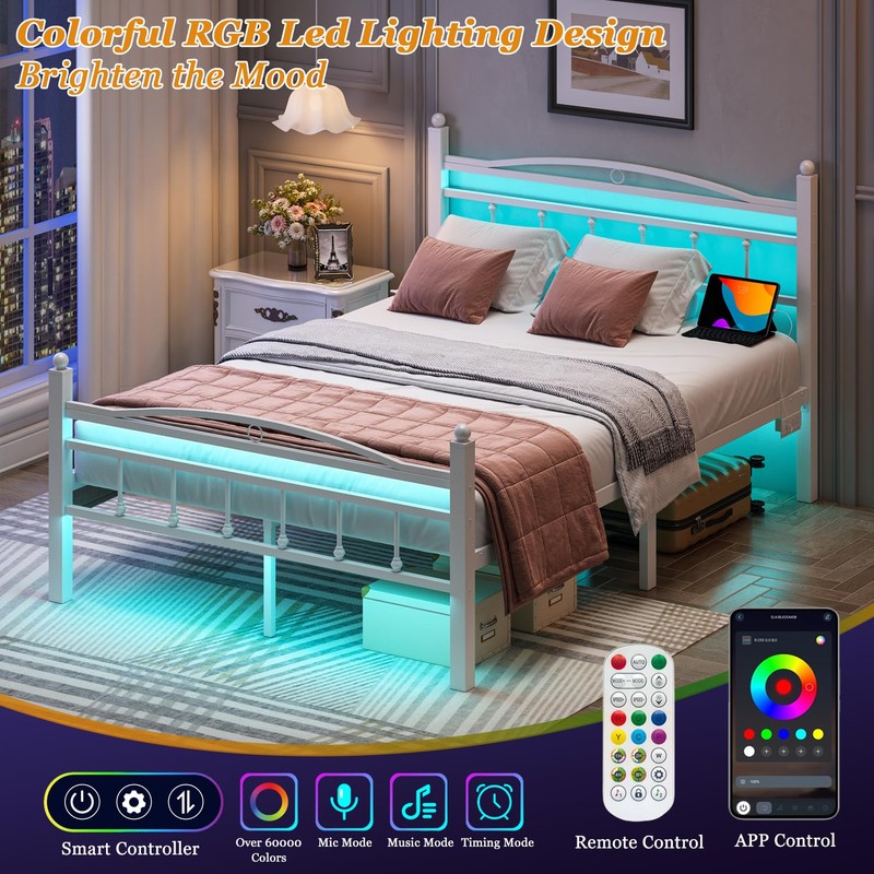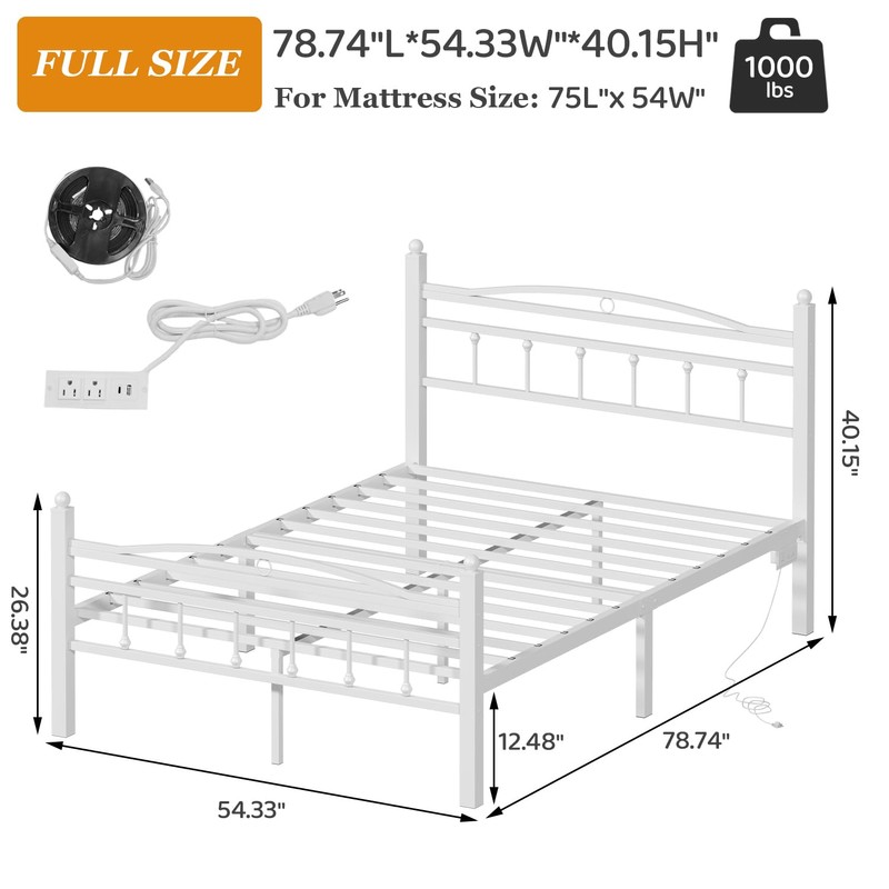 Jenmit Full Size Bed Frame with Headboard, Metal Platform Bed Frame with Charging Station & LED Lights, Storage Space Under Bed, No Box Spring Needed, Noise Free, Easy Assembly, White