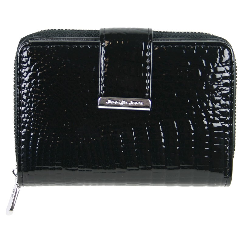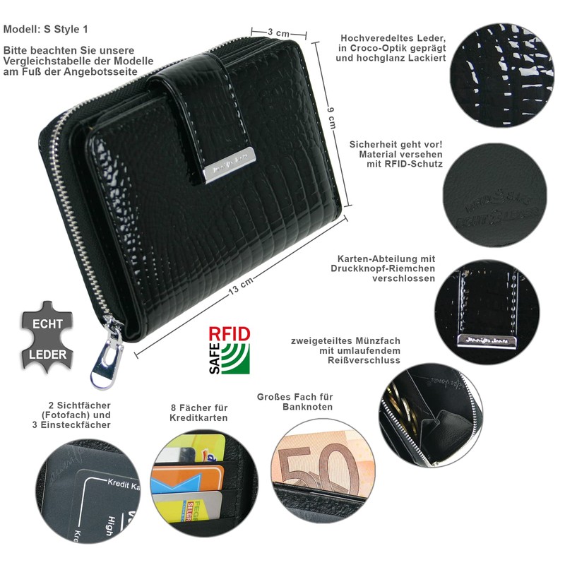 Jennifer Jones Genuine Leather Women's Purse – Fashionable Croco Gloss Look – RFID, black, Modern