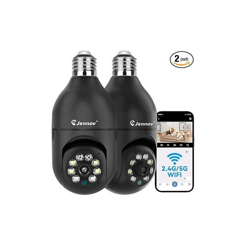 Jennov Light Bulb Security Camera, 360°/2k HD Wireless Camera, 5/2.4Ghz Wi-Fi Light Socket Camera with Auto Tracking, AI Human Detection, Compatible with Alexa for Indoor&Outdoor Home Security - pcs: Light Bulb Cam - Black