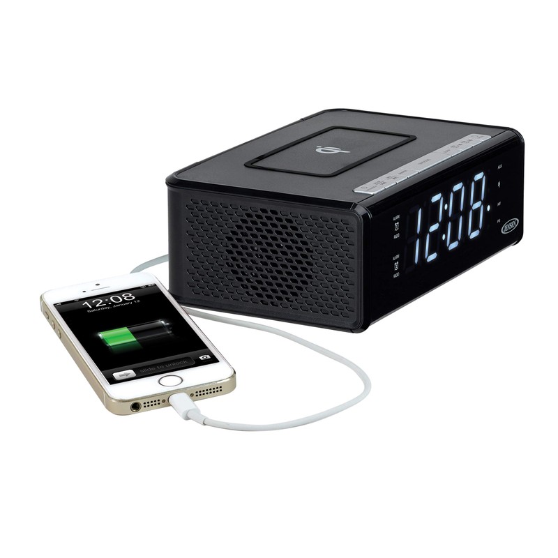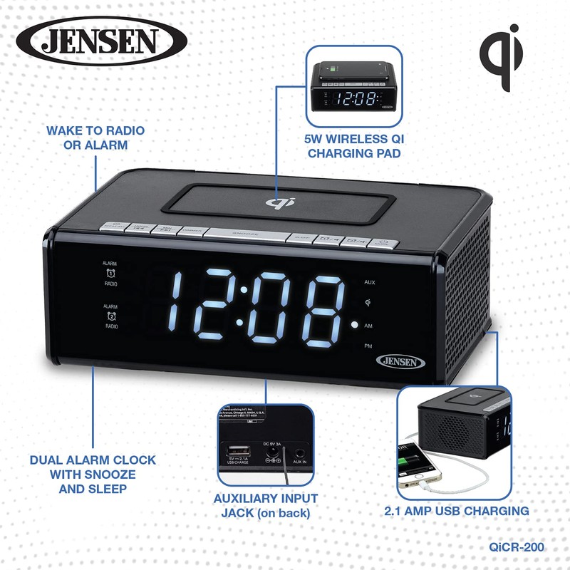 Jensen QiCR-200 Dual Alarm Clock Radio with Qi Charging, White, 9.40in. x 5.00in. x 3.00in.