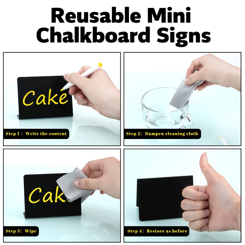 - 【Unlimited Re-writes】This small chalkboard is matte black, you can easily write what you want on these chalk boards with our included erasable color markers, wipe it with water after use and it will be clean again for next time use. These chalk board signs for tables are more durable and eco-friendly than paper cards, waterproof material, won't be damaged by water, and can be reused, greatly saving money.