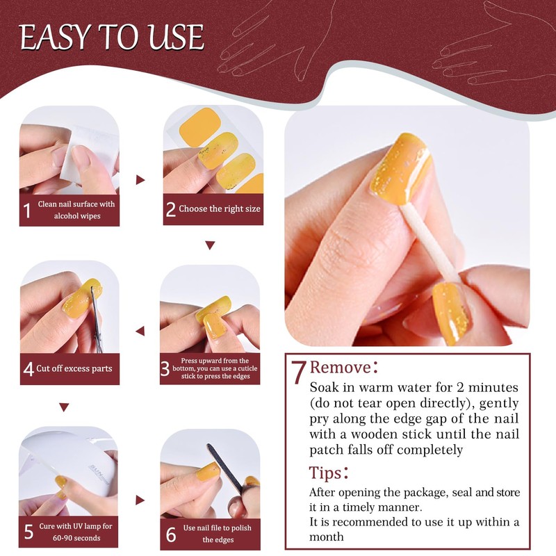 - Safe & Hassle-Free Removal - Concerned about damaging your nails? Fear not! Our gel nail stickers are designed for damage-free removal. Simply soak your nails in warm soapy water and gently lift the edges of the stickers. No harsh chemicals or scraping needed, preserving the health and beauty of your natural nails.