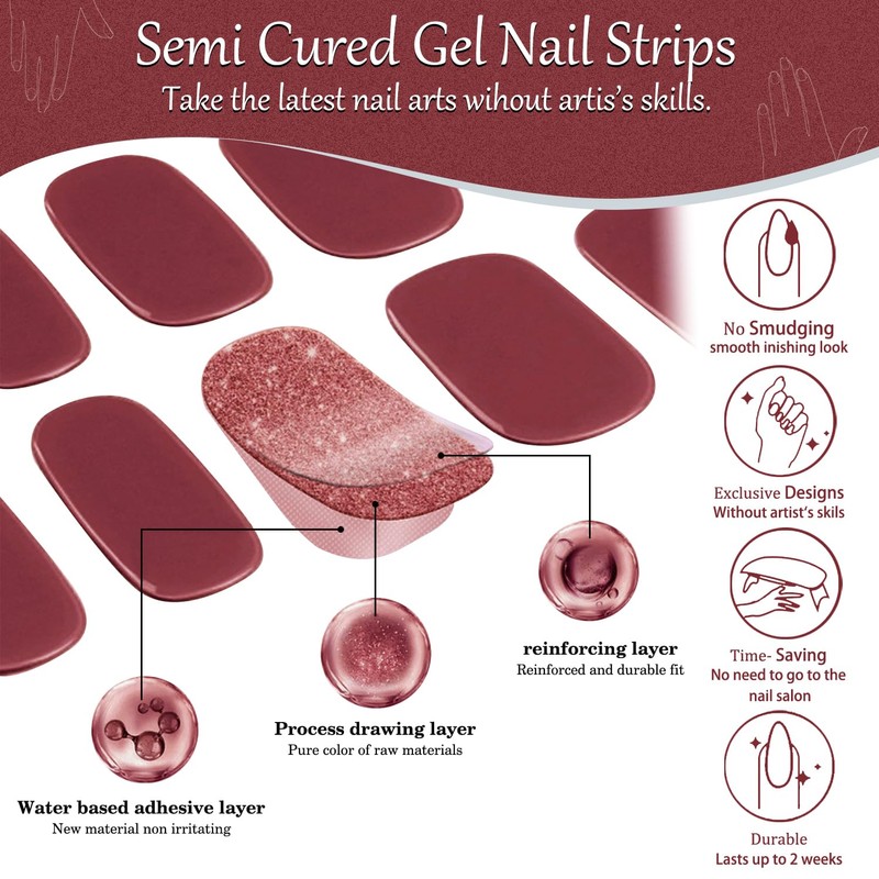 - UV Semi-Cured Technology - Our stickers are made from a unique, light-sensitive UV gel that is semi-cured for optimal flexibility during application. This means they effortlessly conform to the curves of your nails, providing a seamless and professional look that lasts. for the curing and lasting effect, a brief exposure to UV or LED light after placement seals the deal, giving you that perfect, glossy finish that stays chip-free for 1-2 weeks.