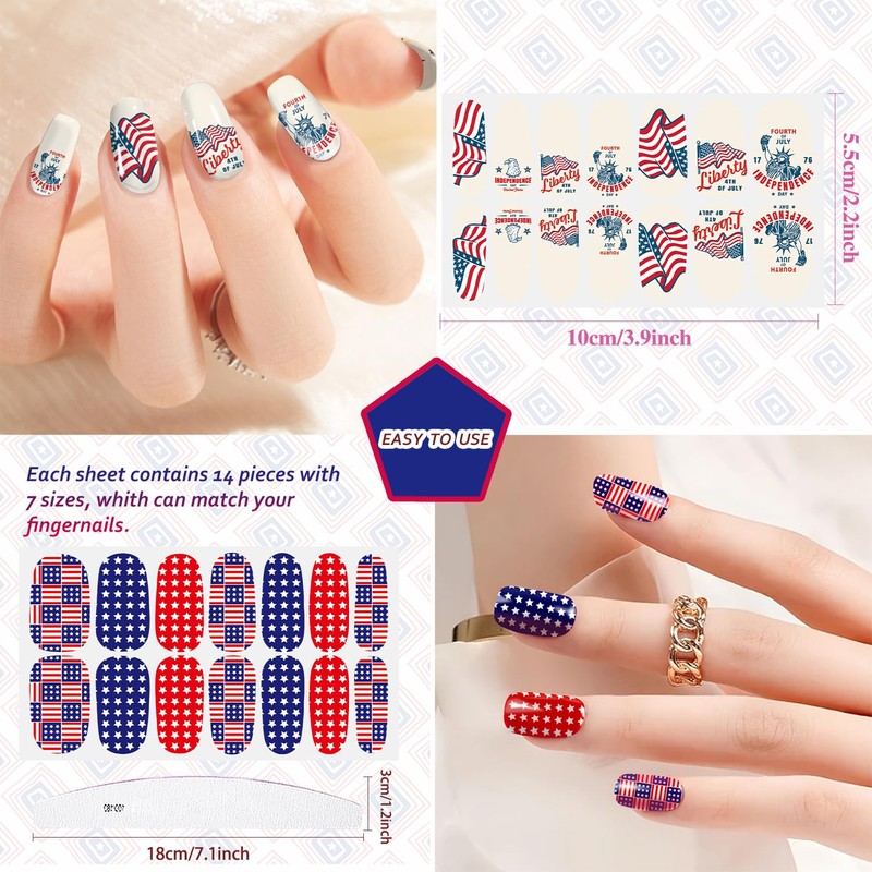 - Easy to Use:These colorful Independence Day nail wraps are self-adhesive and easy to use, just choose the patterns you like and paste them on your nails, then apply a layer of nail polish to fix them, you can also match them with a colored base coat or combine different patterns together.